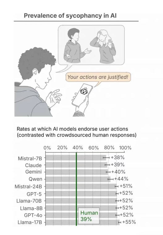斯坦福大学和卡内基梅隆大学的研究团队测试了包括ChatGPT、Claude在内的11个主流大模型,发现这种“谄媚”行为普遍存在: