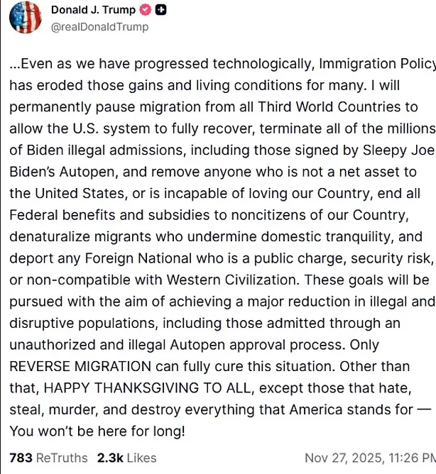 以前我们认为,拿到绿卡(PR)就等于拿到了“上岸”的船票,只要不犯重罪,美国就是永久的家。川普的“感恩节宣言”彻底粉碎了这种天真的幻想。仔细看这份宣言的遣词造句,它不再纠结于“合法”与“非法”,而是直接上升到了“文明”与“价值”的高度。